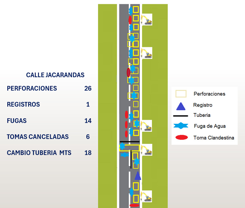 •El primer punto para trabajar era en frente al lote 425 de Jacarandas, se abriría con una retroexcavadora de martillo, donde pasa el tubo general, para poder diagnosticar y ver alternativas donde seguir el ramal principal.